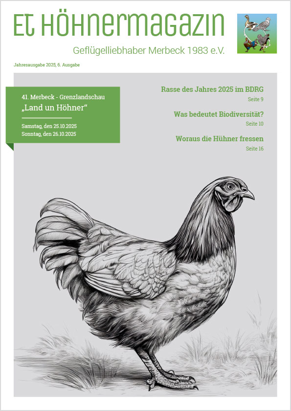 Unser Geflügelzuchtverein steht für fundiertes Know-how und wir möchten mit unserem Höhnermagazin ein kleines Nachschlagewerk rund um Themen der Geflügelzucht bieten. Als erfahrene Geflügelzüchter unterstützen wir Sie in unserem Magazin mit wertvollen Informationen und praktischen Tipps zu Themen wie, Rasse des Jahres, seltene Züchtungen, Züchtung & Vererbungslehre, Schönheitsbewertung, Gesundheit & Vogelgrippe, Ernährung, Eierbewertung, Jugendarbeit mit Nachwuchsförderung, usw., ...