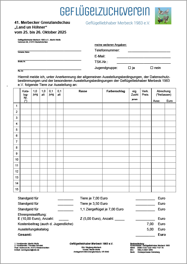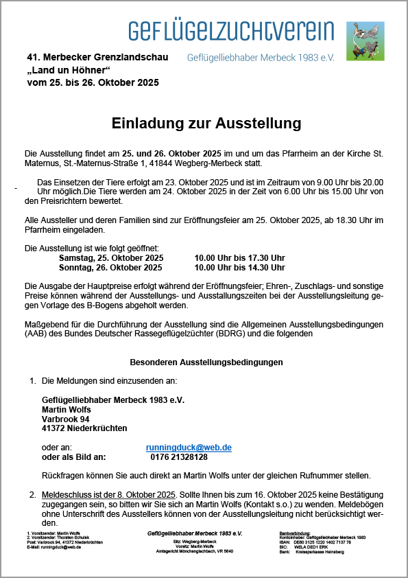 Herzliche Einladung zur überregionalen Geflügelausstellung! Erleben Sie die große 41. Merbecker Grenzlandschau „Land un Höhner“ im Oktober 2025! Das Event für Züchter, Interessierte und die ganze Familie! Es erwartet Sie im und am Pfarrheim sowie im idyllischen Pfarrpark eine faszinierende Rassegeflügelschau mit ca. 200 Tieren.